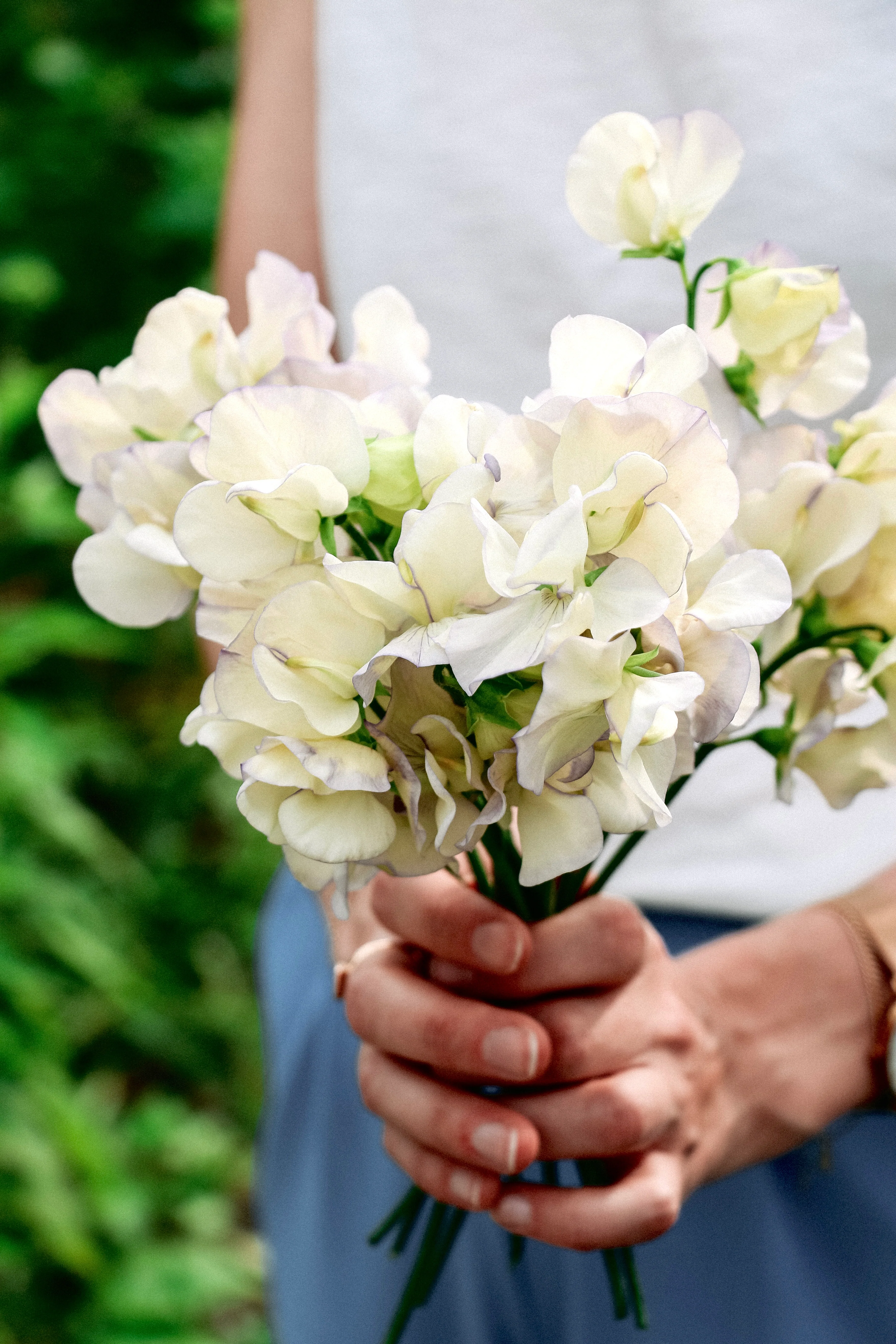 Oude Lathyrus variëteit met crèmewitte bloemen die een blauwroze rand hebben. Ze ruiken fantastisch. Goede tuinplant en plukbloem.